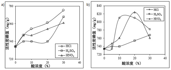 在這項研究中測試的第一個活化處理是化學活化。這種再活化包括在兩種溫度(18°C和50°C)下使用四種不同濃度(5%,10%,20%,30%)的三種無機酸(HCl,H 2 SO 4和HNO 3)進行酸洗。圖1表示了分別在18°C和50°C酸洗后,這些酸的濃度對廢活性炭碘值的影響。