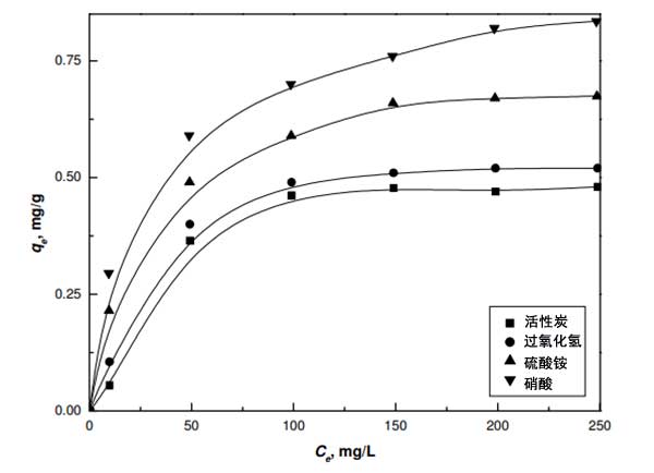 用活性炭和改性活性炭進(jìn)行平衡吸附實(shí)驗(yàn),以評(píng)估它們使用合成的鎳廢水從水性介質(zhì)中除去二價(jià)鎳的能力。通過用0.1g活性炭與50mL濃度范圍為10mg/L至250mg/L的Ni(II)溶液平衡進(jìn)行實(shí)驗(yàn),結(jié)果顯示在圖2中;钚蕴康拿靠宋饺萘恐蛋匆韵马樞蛟黾樱夯钚蕴>過氧化氫>硫酸銨>濃硝酸。氧化活性炭的容量增加是由于存在大量酸性基團(tuán),其可以與水溶液中存在的陽離子鎳交換它們的質(zhì)子。