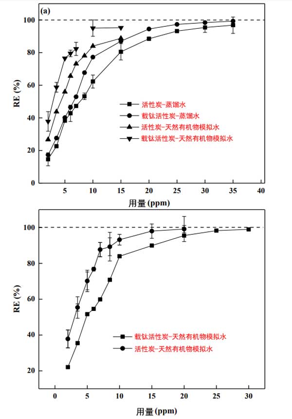 天然有機物的主要成分是腐植酸和單寧酸,因為它們普遍存在于各種天然水中。圖3顯示了從蒸餾水和天然有機物水中消除2-甲基異冰片的情況,這取決于光降解前后催化劑的用量。如圖3a所示,發(fā)現兩種催化劑在天然有機物水中的去除更接近。然而,腐植酸和單寧酸的存在導致活性炭和載鈦活性炭對2-甲基異冰片的吸附能力顯著降低。此外,為了達到氣味閾值濃度值,兩種催化劑在低天然有機物濃度的水中所需的劑量比在蒸餾水中增加了大約一倍。這種現象表明天然有機物和2-甲基異冰片之間對于兩種催化劑的活性位點存在競爭關系。同時,值得注意的是,當微生物分子接近模型污染物時,競爭吸附最強。然而,在光降解后,載鈦活性炭對2-甲基異冰片的去除效率顯著提高(圖3b)。