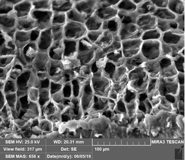 對一個碳化硅樣品進(jìn)行掃描電鏡(SEM)成像,以確定其表面白色物質(zhì)的組成。在掃描電子顯微鏡下分析時,確定該材料為碳化硅纖維,范圍為6-10µm。從爐中取出的樣品如圖3頂部所示,隔板下方的樣品為活性炭。