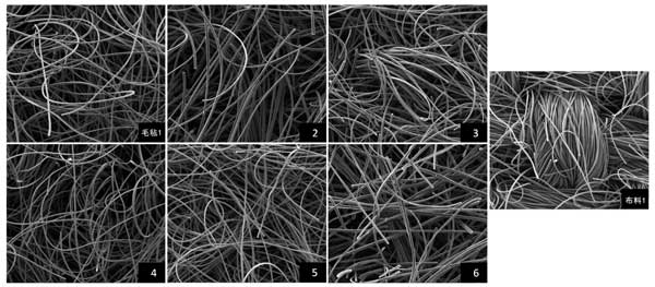 活性炭材料的結(jié)構(gòu)特性,包括編織類型、厚度、密度、BET表面積和微孔率。非織造纖維型比織造活性炭型厚2至4.5倍,但密度不如活性炭,使毛氈型具有海綿狀外貌;钚蕴坷w維材料的BET表面積都很大,微孔面積也比較大。平均微孔面積百分比范圍為83.9%至93.2%,平均孔徑范圍為1.59至1.70nm(<2nm),表明活性炭材料主要是微孔的。BET表面積與微孔面積(r=0.997)呈強正相關(guān),但與微孔面積百分比(r=-0.982)呈強負相關(guān);钚蕴坎牧现欣w維的組織顯示在SEM圖像中200倍放大倍數(shù)下,毛氈型顯示隨機排列的松散無紡纖維,而布料型顯示緊密編織的纖維,外觀更致密(圖1)。