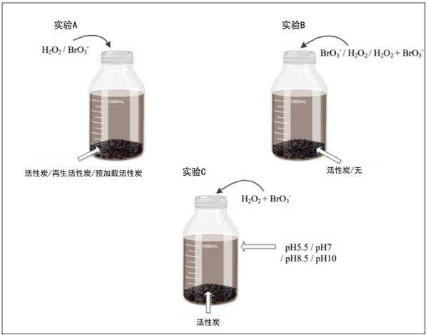 在對50家飲用水公用設(shè)施進行的調(diào)查中,獲得過氧化氫和溴化物的平均值來當做測試用水。在所有實驗中,批量反應(yīng)器都用薄箔包裹。制備0.052µmol/L溴酸鈉溶液并加入間歇反應(yīng)器中以獲得0.5µmol/L溴酸鹽的濃度。高級氧化工藝中的出水殘留過氧化氫濃度不會超過180µmol/L。因此,在本研究中,將150µmol/過氧化氫加入到間歇式反應(yīng)器中。如圖1所示,在23–27℃的環(huán)境溫度下,使用36個批次玻璃瓶進行了一系列實驗;钚蕴坑昧渴冀K為5g/L,過氧化氫和溴酸鹽濃度始終分別為150µmol/L和0.5µmol/L。所有裝有過氧化氫的間歇式反應(yīng)器都用鋁箔覆蓋,以防止過氧化氫被光潛在降解。在如圖1所示的實驗中,使用16個間歇式反應(yīng)器和三種不同的活性炭(活性炭、再生活性炭和預(yù)加載活性炭)來研究不同運行時間的活性炭對溴酸鹽和過氧化氫的去除,該實驗涉及八個處理組。