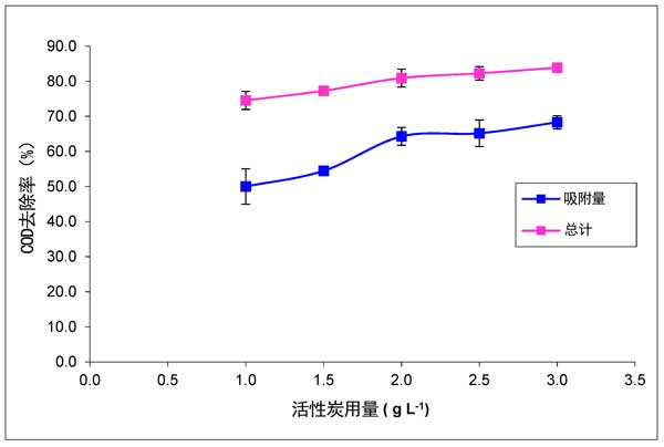 圖2顯示了在25℃、pH=7.5和170rpm的攪拌速率下,不同活性炭用量對COD去除的影響,持續(xù)24小時。我們測試了1.0、1.5、2.0、2.5和3.0g活性炭以確定合適吸附劑劑量。隨著活性炭濃度從1g增加到3g,觀察到COD去除率從50.0±5.1%和74.5±2.6%逐漸增加到吸附和總量的68.3±1.9%和83.9±1.0%。COD濃度從280.0±28.3略微下降至177.5±10.6mg。許多研究都報告說,隨著活性炭用量的增加,有機(jī)材料的去除率也會增加,這可以通過總比表面積和吸附劑上的活性位點(diǎn)來解釋。
