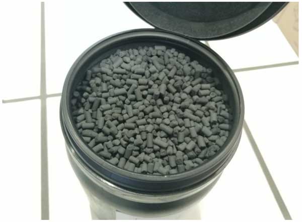 根據(jù)直接使用瓶裝真實(shí)氣體所獲得的結(jié)果,包括列出的催化劑毒物,這會(huì)導(dǎo)致催化劑快速降解,因此在第一個(gè)反應(yīng)器的上游安裝了活性炭過(guò)濾器。為此,將金屬氧化物浸漬的活性炭顆粒添加到氣體混合站。這些顆粒專(zhuān)門(mén)開(kāi)發(fā)用于從缺氧氣流(例如CO2、N2、CO和H2)中去除硫化氫、有機(jī)硫醇、二氧化硫、硫化羰和氮氧化物。它們的銅含量為7%(以CuO計(jì)),直徑為3mm,長(zhǎng)度為7mm(圖3)。將總共約300毫升的這些顆;钚蕴考尤霘怏w混合站。