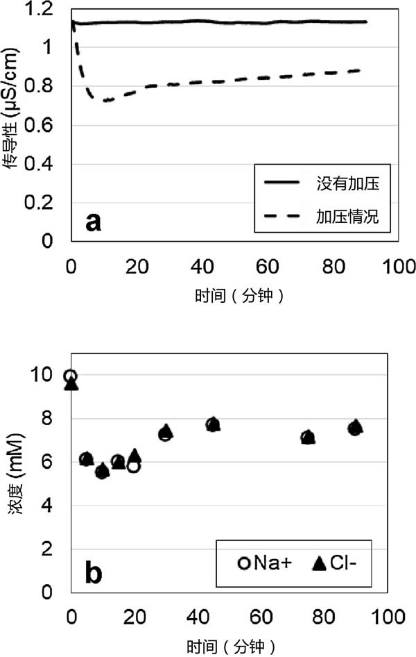 圖2:在離子去除實驗(電壓1.2V,活性炭厚度10mm,進水10 mM NaCl aq,壓力677kPa)期間,電導(dǎo)率和(b)Na+和Cl-濃度隨時間的變化(a)。