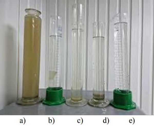 圖3:廢水處理效率,a-原始廢水,b-木質(zhì)活性炭,c-椰殼活性炭,d-果殼活性炭,e-煤質(zhì)活性炭。