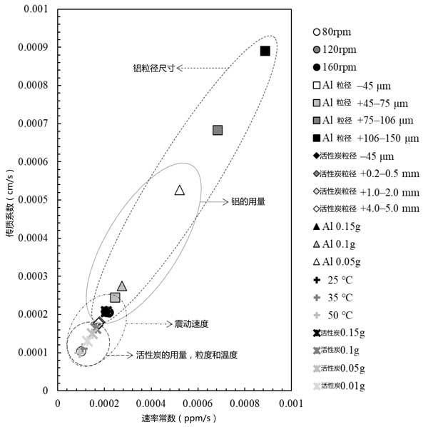 圖3:基于本研究中所有黃金回收結果的速率常數(shù)和傳質系數(shù)圖。