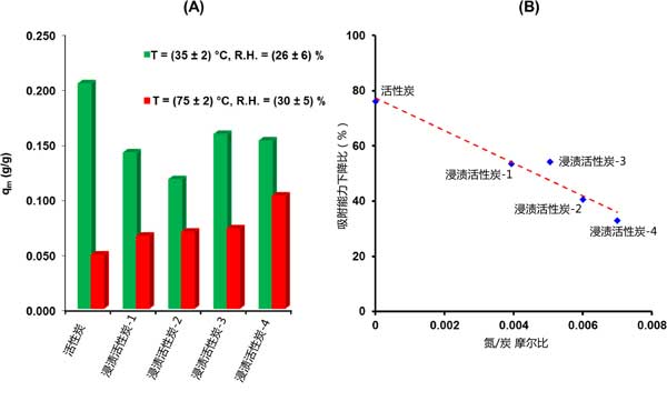 甲基碘吸附容量的降低程度取決于活性炭的性質(zhì)(圖2(A))。正如預(yù)期的那樣,對于未浸漬的吸附劑觀察到有害的影響,其中僅已知不涉及CH3I吸附的特定相互作用。更準確地說,當從活性炭材料的第一組條件轉(zhuǎn)移到第二組條件時,概述了大約76%的吸附容量下降(圖2)。在這方面,為了克服與水蒸氣和溫度相關(guān)的影響,三乙二胺浸漬是必不可少的。最近,由于水對三乙二胺分子具有很強的親和力,因此三乙二胺浸漬可以通過釋放載體的活性位點來提高活性炭的保留性能]。此外,與其他機制(尤其是物理吸附)相比,化學吸附甲基碘的比例隨著溫度升高而增加。然后,三乙二胺與甲基碘的化學反應(yīng)性將在較高溫度下增強。得到的結(jié)果(圖2)表明隨著氮含量的增加,在“惡劣條件”下的保留性能逐漸提高。因此,以浸漬中含量最高為特征的活性炭-4吸附劑的吸附容量僅降低了33%。更準確地說,可以推斷出所有考慮的吸附劑的減少幅度和摩爾比之間的準線性關(guān)系(圖2B)。根據(jù)這種關(guān)系,似乎需要浸漬,以確保在更嚴格的條件下更牢固地固定甲基碘。
