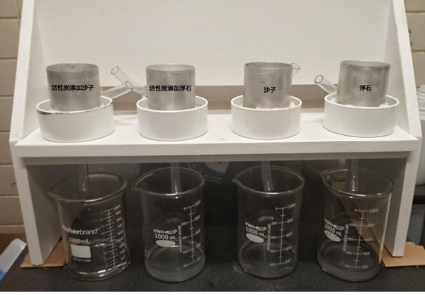 酸二氫鉀在去離子水中制備磷溶液,將活性炭稱重到試管中,,并用36mL的16.3mg/L-1正磷酸鹽平衡,僅包括沙子或浮石樣品。將管在端到端振蕩器上以90min-1的頻率平衡24小時(shí),并通過0.2-μm膜過濾器過濾上清液。根據(jù)鉬酸鹽法,使用UV-VIS分光光度計(jì)分析濾液中的正磷酸鹽。總共16根柱子(直徑7.62厘米,高7.62厘米)用沙子或浮石填充到4.56厘米的深度(圖2)。十六列對應(yīng)于由兩種過濾器(沙子或浮石)和四種活性炭改進(jìn)材料組成的實(shí)驗(yàn),包括對照(無添加活性炭),一式兩份。將含活性炭改良劑和不含活性炭改良劑(按重量計(jì)5%)的沙子或浮石混合,然后將其干填充到柱中。每個(gè)柱子的底部都用粗棉布保護(hù),這樣可以大限度地減少過濾材料的損失。