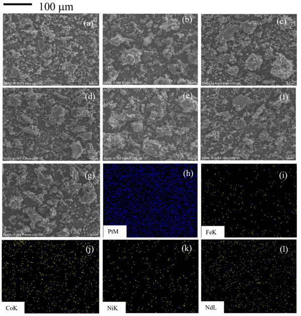 圖1:(a)載鉑活性炭,(b)載鐵鉑活性炭,(c)載磁鐵,(d)載磁鐵鉑,(e)載鈷鉑,(f)載鎳鉑的SEM照片和(g)載釹鉑活性炭催化劑以及(h)鉑、(i)鐵、(j)鈷、(k)鎳和(l)釹在活性炭上的相應(yīng)元素映射圖像。