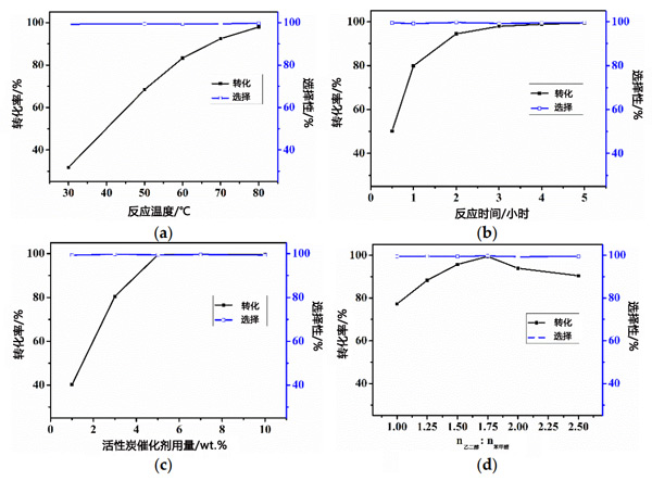 為了確定活性炭的催化性能,討論了反應(yīng)溫度、反應(yīng)時間、催化劑用量和醇/醛摩爾比對苯甲醛轉(zhuǎn)化率的影響。測試結(jié)果如圖2a-d所示。結(jié)果表明,隨著反應(yīng)溫度、反應(yīng)時間和催化劑用量的增加,苯甲醛轉(zhuǎn)化率逐漸升高,直至反應(yīng)溫度達到80℃,反應(yīng)時間達到5小時,催化劑用量為苯甲醛質(zhì)量的5%。在上述條件下,苯甲醛轉(zhuǎn)化率在99%以上。當醇/醛的摩爾比低于1.75時,苯甲醛的轉(zhuǎn)化率隨著乙烯醇的增加而逐漸增加。當乙二醇用量繼續(xù)增加時,苯甲醛轉(zhuǎn)化率有一定程度的下降。苯甲醛轉(zhuǎn)化率降低的主要原因是隨著乙二醇用量的增加,反應(yīng)體系中苯甲醛的濃度降低,導(dǎo)致分子間的碰撞減少。在所有條件下,苯甲醛乙二醇縮醛的選擇性均在99%以上,表明存在競爭催化機制。