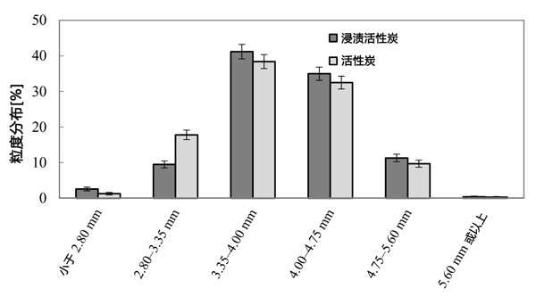 在一系列實(shí)驗(yàn)中使用了用碘酸和無(wú)機(jī)酸浸漬的顆;钚蕴。根據(jù)測(cè)量粒度分布、堆積密度和甲苯吸附能力,和測(cè)量浸漬活性炭的pH值。粒度按篩子大小分類(lèi)。通過(guò)測(cè)量包裝在200mL容器中的浸漬活性炭的重量來(lái)計(jì)算堆積密度。通過(guò)將1/10甲苯蒸氣流到10g浸漬活性炭中,測(cè)量甲苯蒸氣吸附前后的重量差,計(jì)算出甲苯吸附容量。將3g浸漬活性炭加入300mL離子交換水中并搖動(dòng)30分鐘,制成活性炭樣品再進(jìn)行pH測(cè)量。圖1顯示了浸漬活性炭和活性炭的粒度分布。對(duì)于浸漬活性炭和活性炭,粒徑均為2.80-5.60毫米。這些粒徑通常是氣體處理的值。通過(guò)浸漬,堆積密度增加,甲苯吸附能力降低。這可能是由于浸漬材料滲入了孔隙。由于金屬的雜質(zhì),活性炭的pH值呈堿性。由于酸解離,通過(guò)浸漬降低了pH值。