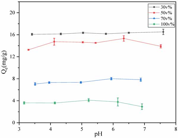 圖1:溶液pH對鄰苯二甲酸二丁酯吸附能力的影響。本文圖例中的每個體積分?jǐn)?shù)為乙醇含量。