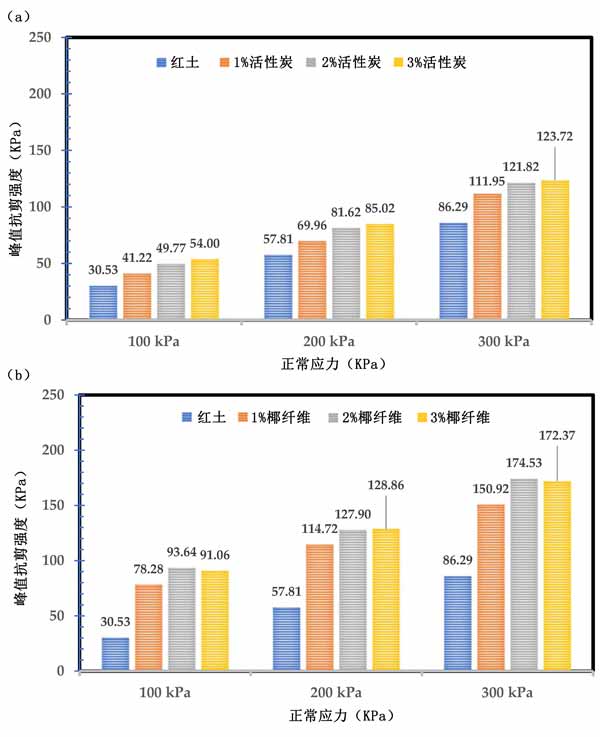 活性炭試樣的剪切強(qiáng)度與剪切應(yīng)變的關(guān)系。峰值剪切強(qiáng)度隨著正應(yīng)力的增加而提高,特別是300kPa正應(yīng)力。此外,添加活性炭增加了峰值剪切強(qiáng)度,并且增強(qiáng)率隨著法向應(yīng)力的增加而增加,如圖4a所示。同樣,添加0.5%的椰殼纖維進(jìn)一步提高了活性炭穩(wěn)定土的峰值剪切強(qiáng)度,如圖4b所示。雖然在天然紅土中添加活性炭會(huì)增加峰值強(qiáng)度,但對(duì)于超過2%的活性炭,增加率并不顯著。例如,活性炭穩(wěn)定土的峰值強(qiáng)度分別為2%和3%活性炭的121.8kPa和123.72kPa?傮w而言,與本研究的結(jié)果相似。發(fā)現(xiàn)在石灰穩(wěn)定土壤中使用椰殼纖維可進(jìn)一步提高抗拉強(qiáng)度和抗壓強(qiáng)度。還觀察到,椰殼纖維的加入提高了膨脹土中的兩個(gè)剪切參數(shù)。