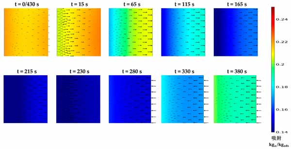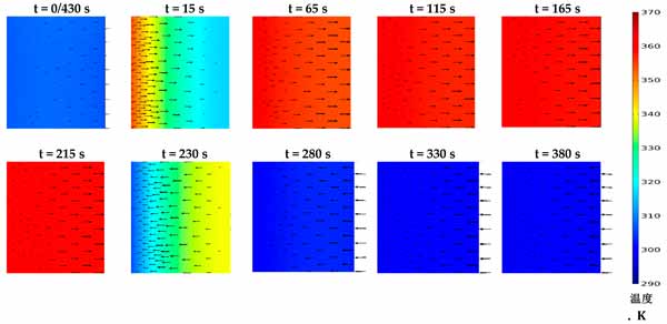 活性炭復合吸附劑的壓力和溫度決定了平衡吸收,它代表了在給定時間分別在吸附和解吸階段可以達到的最大和最小吸收容量。然而,顆粒內和顆粒間的傳質阻力表明吸附材料在每種給定情況下可以多快達到其平衡吸收能力。這突出了在本研究中同時求解兩種傳質機制與其他控制方程的重要性,以顯示促進傳熱對傳質的凈效應。圖2顯示了在430秒循環(huán)時間內,考慮到預熱和預冷階段均為30秒的時間間隔內代表性部分的固結吸附劑域的溫度分布。