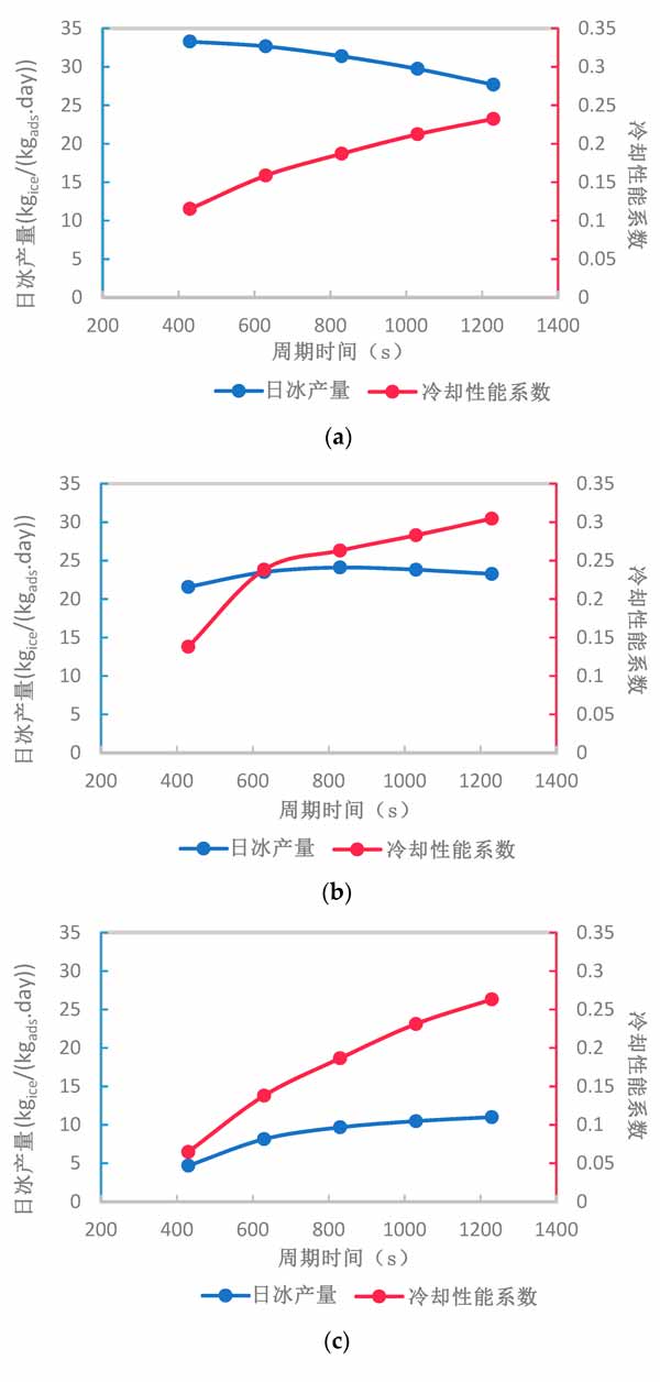 在活性炭厚度為2、5和10mm時,循環(huán)時間的變化對制冰系統(tǒng)的每日制冰量和冷卻性能系數(shù)的凈影響如圖4所示?傮w而言,在給定范圍內增加循環(huán)時間可以增加或減少系統(tǒng)的每日制冰量,具體取決于活性炭復合材料的厚度。然而,無論活性炭復合材料的厚度如何,系統(tǒng)的冷卻性能系數(shù)通過增加循環(huán)時間而增加。盡管如此,系統(tǒng)冷卻性能系數(shù)在1230的較長循環(huán)時間和5mm活性炭復合材料厚度下達到其最大值。通過增加活性炭復合材料的厚度,日冰產量在不同循環(huán)時間內的變化范圍顯著減小,這可以通過比較圖4a-c中給出的每日制冰量范圍看出。這歸因于活性炭復合材料厚度較厚時有效吸收的減少。