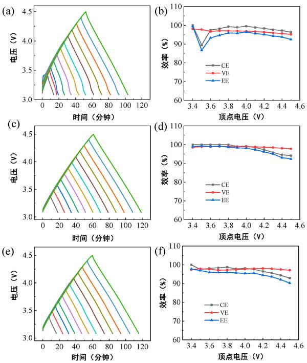 圖1:活性炭鋰半電池在不同鋰離子電解質(zhì)中從pzc到各種頂點(diǎn)電壓的恒電流充放電曲線:(a)EDD,(c)EPD,和(e)PCE;相應(yīng)的EE、CE和VE值作為頂點(diǎn)電壓的函數(shù):(b)EDD,(d)EPD,和(f)PCE。
