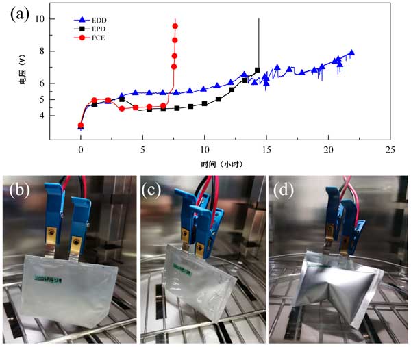 圖2:過充至10.0V的活性炭鋰半電池:(a)電壓隨時(shí)間變化曲線,以及使用不同電解質(zhì)過充過程后半電池的照片:(b)EPD,(c)PCE和(d)EDD。