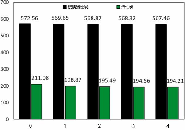 為了研究吸附劑吸收汽油蒸汽的性能,我們進一步評估了樣品在吸附-解吸循環(huán)中的可重復(fù)使用性。在恒溫下,1小時后,當(dāng)吸附劑達到飽和狀態(tài)時,浸漬再生過程。四個吸附循環(huán)后,蒸汽吸附容量為567mg/g,所用吸附劑保持大量吸收分子。HMTA-AC-D樣品表明蒸汽吸收略有減少約0.89%,而活性炭樣品的這一量為7.9%(圖3)。在高循環(huán)下,由于孔隙的逐漸破壞和不完全脫氣,吸收量可能會顯著降低。根據(jù)我們的發(fā)現(xiàn),與文獻相比,制成的吸附劑在物理和熱學(xué)上表現(xiàn)出更高的穩(wěn)定性。這些結(jié)果表明,樣品在回收汽油蒸汽時具有很高的可持續(xù)性,可以作為一種有效的吸附劑提出并考慮。