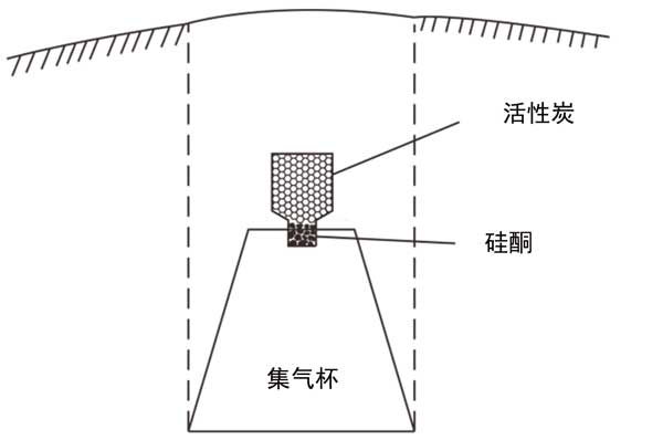 所用儀器為活性炭氡檢測(cè)儀。在現(xiàn)場(chǎng)調(diào)查中,將使用過(guò)的活性炭烘烤干燥。冷卻后,將活性炭按照適當(dāng)?shù)臉?biāo)準(zhǔn)放入取樣器中,用硅膠塞規(guī)避地下水分的影響,然后將樣品密封備用。接下來(lái),將裝滿的采樣器口朝下放置在測(cè)試坑中,如圖1所示。采樣器和集氣杯穩(wěn)定固定,上面蓋上塑料布,密封坑口。當(dāng)埋杯到預(yù)設(shè)時(shí)間(至少5天)時(shí),取出采樣器,仔細(xì)填寫(xiě)采樣時(shí)間和氣候。然后將采樣器放入經(jīng)過(guò)測(cè)試和校準(zhǔn)的活性炭氡氣檢測(cè)儀中,記錄每個(gè)采樣器的線數(shù)和點(diǎn)數(shù)。