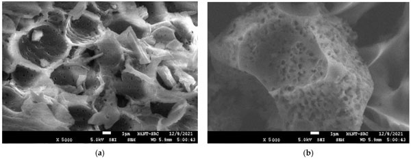 使用FESEM分析觀察了活性炭產(chǎn)品的浸漬和碳化溫度影響的形態(tài)變化。圖1a、b描繪了木質(zhì)素在被激活之前的表面形態(tài)。它顯示出厚而平坦的圖案,中間有小裂縫。這歸因于大量的木質(zhì)素,一種酚類聚合物,賦予植物結(jié)構(gòu)強度,使其具有堅硬粗糙的木材狀結(jié)構(gòu)。在圖1b中,發(fā)現(xiàn)前體具有壓實的表面,上面有淺而堵塞的孔隙圖案。這可能是由于烘箱干燥過程中預處理和加熱過程的反應。從圖1a、b,由于無孔表面的存在,表面清楚地顯示為不令人滿意的吸附材料。