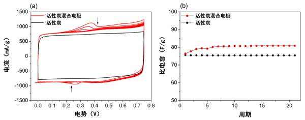 通過評估電化學(xué)性能,初步測試了活性炭復(fù)合材料作為混合電極的潛在應(yīng)用。為此,通過將浸泡在1M/H2SO4電解質(zhì)中的隔膜夾在兩個(gè)相同的電極(活性炭或混合材料)之間來組裝對稱電池。圖3a顯示了活性炭和混合材料在20mV/s恒定掃描速率下的循環(huán)極化(CP)曲線。由于雙電層電容(EDLC)的影響,交流對稱電池的CP曲線形狀為矩形。另一方面,活性炭混合電極觀察到準(zhǔn)矩形CP曲線NPs對稱細(xì)胞,具有源自納米銀的各種氧化還原波,與矩形(電容)包絡(luò)重疊。這種CP結(jié)構(gòu)表明法拉第和EDLC兩種電荷存儲機(jī)制的共存。值得注意的是,隨著循環(huán)次數(shù)的增加,觀察到的銀波變得更小并且變得難以察覺,這表明存在一定程度的不穩(wěn)定,正如對游離多金屬氧酸鹽納米銀所觀察到的那樣。白銀波浪的減少之間存在相關(guān)性(圖3a)在前幾個(gè)周期內(nèi),根據(jù)CP面積計(jì)算出的比電容有所增加(圖3b)。這可以通過氧化銀薄層與銀的比電容差異來解釋。盡管如此活性炭混合電極的比電容略高于裸活性炭電極,活性炭的比電容為75F/g,活性炭混合電極在20次循環(huán)后達(dá)到81F/g。該結(jié)果表明,混合材料具有電活性,并且在對稱超級電容器配置中超過了一定程度的交流電;钚蕴亢突旌想姌O電池的比電容隨著電流密度的增加而降低。對于活性炭混合材料在掃描速率為2mV/s時(shí)最高值為83.5F/g,在掃描速率為50mV/s時(shí)進(jìn)一步下降至77.5F/g。高掃描速率下比電容的降低歸因于電解質(zhì)離子的低擴(kuò)散。由于時(shí)間限制,高倍率充放電過程中電解液中的離子運(yùn)動始終受到擴(kuò)散限制,僅利用外層活性表面進(jìn)行電荷存儲。減慢掃描速率可以讓電解質(zhì)更徹底地滲透到孔隙中,并與電極材料的內(nèi)表面有更多的接觸,從而導(dǎo)致電極表面存儲更多的電荷(更大的電容)。