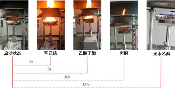 圖3顯示了四個(gè)樣品的初始燃燒火焰和點(diǎn)火時(shí)間?梢钥闯,四個(gè)樣本的點(diǎn)火時(shí)間按照環(huán)己烷<乙酸丁酯<丙酮<純無(wú)水乙醇的順序遞增。顯然,吸附VOCs后的樣品更易燃燒,其中環(huán)己烷樣品是最容易被點(diǎn)燃的一種。從火焰尺度來(lái)看,吸附樣品的火焰高度較大,燃燒強(qiáng)度較強(qiáng)。此外,純無(wú)水乙醇樣品的火焰顏色為淺藍(lán)色,表明純無(wú)水乙醇燃燒時(shí)樣品的表面溫度低于其他三個(gè)吸附樣品。