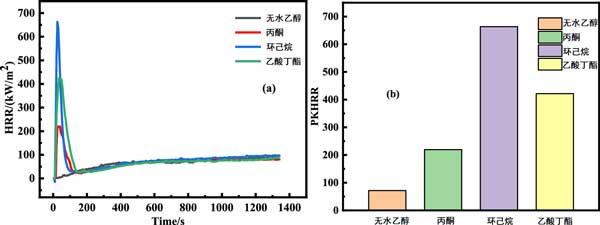 圖4b顯示了四個(gè)樣品的最大放熱率(PkHRR),其順序?yàn)榄h(huán)己烷(663.41kW/m2)>乙酸丁酯(421.4kW/m2)>丙酮(219.49kW/m2)>純無(wú)水乙醇(71.4kW/m2)。觀(guān)察到3個(gè)VOCs吸附樣品的PkHRR遠(yuǎn)高于ROW,其中環(huán)己烷樣品的Pk放熱率最高,表明CYH樣品的燃燒危害最嚴(yán)重。