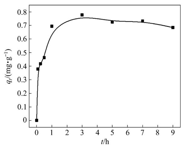 用100mL硫代硫酸銅溶液進(jìn)行銅吸附動(dòng)力學(xué)試驗(yàn),初始銅濃度為3g/L。硫代硫酸鹽與銅的摩爾比為8:1。除另有說(shuō)明外,0.5g活性炭用于吸附試驗(yàn)。圖2顯示了Cu(S2O3)23−在活性炭上的吸附動(dòng)力學(xué);钚蕴繉(duì)銅的吸附容量在前1h急劇增加,隨后略有下降并趨于穩(wěn)定。
