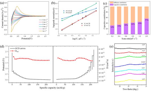 圖4:(a)活性炭從0.2到2mVs-1的CV曲線。(b)峰值電流與確定b值時(shí)的掃描速率之間的關(guān)系。(c)不同掃描速率下電容和擴(kuò)散主導(dǎo)容量的百分比貢獻(xiàn)。(d)活性炭電極的GITT測(cè)試結(jié)果。(e)活性炭電極在鈉化和脫鈉各個(gè)階段的異位XRD譜。