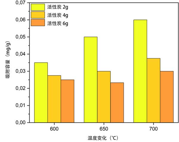 從測試結(jié)果可以看出,在700℃溫度下,吸附劑質(zhì)量為6g,濃度為0.2mg/L,降低百分比為90%。氨(NH3)濃度的降低與質(zhì)量變化的增加和活化溫度的升高成正比。吸附劑質(zhì)量越大且溫度越高,氨(NH3)濃度降低得越多。在圖2中,顯示了活性炭的吸附容量值。因此,可以得出結(jié)論,吸附劑質(zhì)量為2g、溫度為700℃時(shí)達(dá)到最高吸附容量,即0.06 mg/g。然而,盡管700℃下6g吸附劑質(zhì)量顯示出氨(NH3)濃度百分比降低,但與700℃下2g吸附劑質(zhì)量相比,其吸附容量仍然較低,為0.03mg/g。這是由于NH3吸附過程是由分子間相互作用驅(qū)動的,例如靜電引力、氫鍵、范德華相互作用等。此外,結(jié)果表明,源自肉豆蔻殼的活性炭可以有效降低氨(NH3)水平。那么活性炭具有良好的穩(wěn)定性,并通過吸附容量值證明。