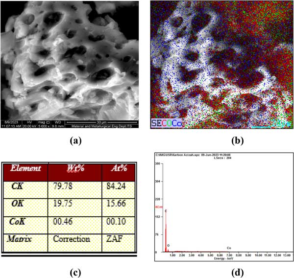 此外,EDX分析結(jié)果表明碳含量高(C=79.78%)和化學(xué)結(jié)合氧(O=19.75%),如圖1和2所示。5c和5d。還存在少量鈷(Co=0.46%),它是在碳化過程中出現(xiàn)的并且沒有得到最佳轉(zhuǎn)化,并且樣品洗滌過程也不是最佳的。下圖中,顯示了樣品的元素分布圖,其中碳為紅色,氧為綠色,鈷為藍(lán)色,分布均勻,如圖3b所示。這會影響吸附孔隙結(jié)構(gòu)的形成。