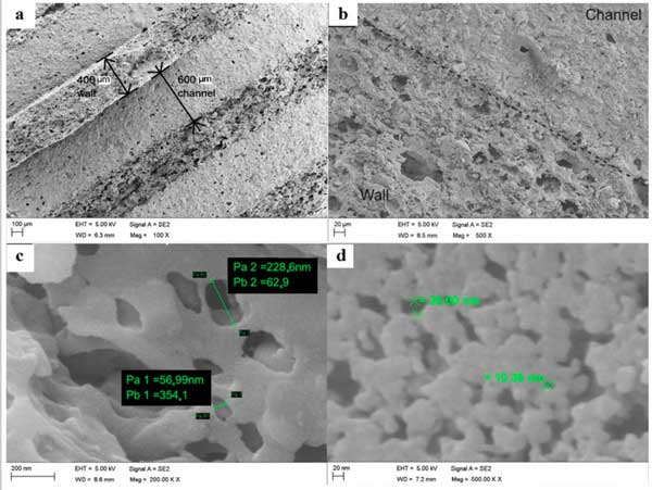 活性炭SEM圖像揭示了材料的孔隙性質(zhì)。圖1a、b中的低放大圖像顯示了具有擠壓(墻)和內(nèi)部(通道)結構差的單體縱向部分的主要形態(tài),其中高放大(圖1c、d)圖像分別顯示了小宏觀和中孔直徑范圍內(nèi)孔內(nèi)部結構的主要形態(tài)。