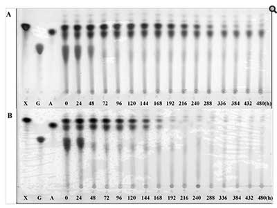 圖3、嗜熱脂肪芽孢桿菌的燒瓶培養(yǎng)肉湯的TLC分析。G,A和X分別表示葡萄糖,阿拉伯糖和木糖標準品。