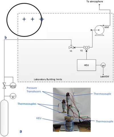 使用設(shè)計為模擬自冷卻罐的換熱機(jī)組(HEU)為200mL容積的圓柱形容器進(jìn)行實驗。該設(shè)備在圖1中示意性地示出; 參見圖1a中的照片。換熱機(jī)組(HEU)的主體由鋁制成,并用黃銅蓋封閉。水浴也是實驗裝置的一部分。