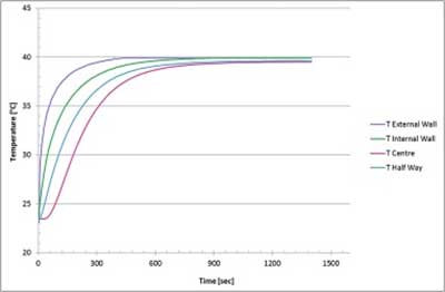 圖2、 當(dāng)設(shè)備從環(huán)境條件轉(zhuǎn)移到40℃的水中時,床中和設(shè)備外表面上的溫度分布。