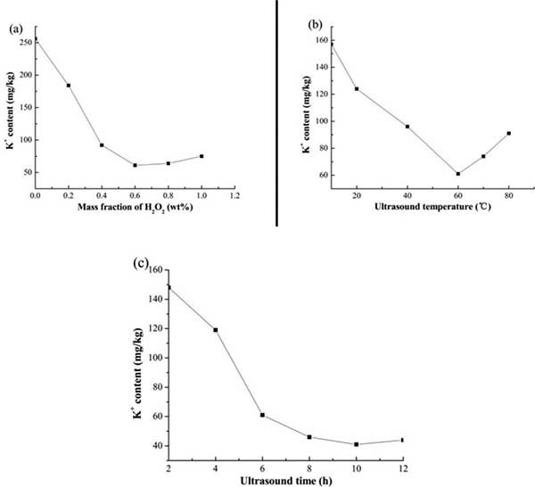 然后對(duì)活性炭(AC-WH 1%/ 120min)進(jìn)行氧化 - 超聲處理以深度除去鉀離子。研究了H2O2溶液的質(zhì)量分?jǐn)?shù),超聲溫度和超聲時(shí)間對(duì)活性炭中鉀離子含量的影響。得到的結(jié)果和圖2所示。H2O2溶液的質(zhì)量分?jǐn)?shù)在超聲時(shí)間6小時(shí)和超聲溫度60℃下在0-1.0重量%的范圍內(nèi)。表明不含H2O2的活性炭的鉀離子含量處理量為256 mg / kg,大大低于活性炭(AC-WH 1%/ 120min)和417 mg / kg,這與超聲波作用能夠加速固體間的液體傳質(zhì)過程,促使交流孔內(nèi)的一些非碳化物質(zhì)與鉀離子一起分散到溶液中。從圖2(a)可以看出,活性炭的鉀離子含量從256顯著降低到61 mg / kg,此后當(dāng)H2O2溶液的質(zhì)量分?jǐn)?shù)從0增加到0.6 wt%時(shí),基本保持不變。。因此,可以說(shuō)H2O2處理對(duì)生產(chǎn)低鉀離子含量的活性炭有很大的影響。一方面,作為氧化劑,H2O2溶液可以減小鉀離子和活性炭孔壁之間的作用力,使其容易轉(zhuǎn)移到溶液中。另一方面,活性炭中的鉀離子可以與一些有機(jī)基團(tuán)以化學(xué)鍵的形式共存,這些有機(jī)基團(tuán)可以通過H2O2溶液的存在而被破壞,使得可以有效的去除活性炭中的鉀離子。