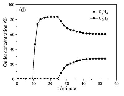 在圖1中可以看出乙烯和乙烷在最初的幾分鐘內(nèi)完全被吸附,但乙烷在8分鐘后穿過管柱。在最初的25分鐘內(nèi),吸附劑保留乙烯,出口物流不含乙烯,然后再通過。最后,50分鐘后出口氣體濃度返回到進料氣體濃度,表明該吸附劑樣品飽和。乙烯的吸附量是通過整合相關(guān)穿透曲線獲得的。