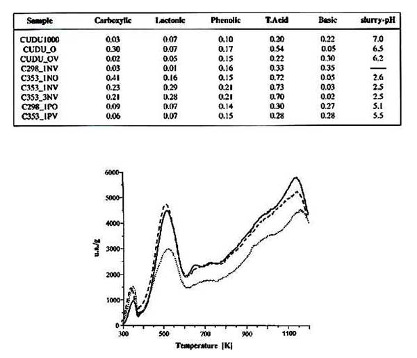 圖1顯示了過(guò)氧化氫處理后產(chǎn)生的活性炭的化學(xué)行為。從上面看出的氧化過(guò)程增加了活性炭的總酸度,并且與羧基和酚類基團(tuán)的增加一致。此外,TPD曲線顯示了放出氣體的增量,峰值集中在與活性炭相同的溫度。低溫和高溫分解組的面積總體增加歸因于羧基-內(nèi)酯類結(jié)構(gòu)和后面的酚類基團(tuán)。H2O2氧化碳的FT-IR光譜在1542和1190cm-1處顯示帶就像那些原始的碳,但后來(lái)的孔隙已經(jīng)擴(kuò)大,顯示出C-O伸展模式的增加。總之,這些研究表明僅在H的性質(zhì)的小變化H2O2處理過(guò)的碳,即,是在氧化時(shí),其類似于由其他研究人員報(bào)告的行為沒(méi)有觀察到變化顯著。其中過(guò)氧化氫溶液的氧化作用明顯地看作羧酸類基團(tuán)的重要減少,伴隨著堿性基團(tuán)的大量增加。