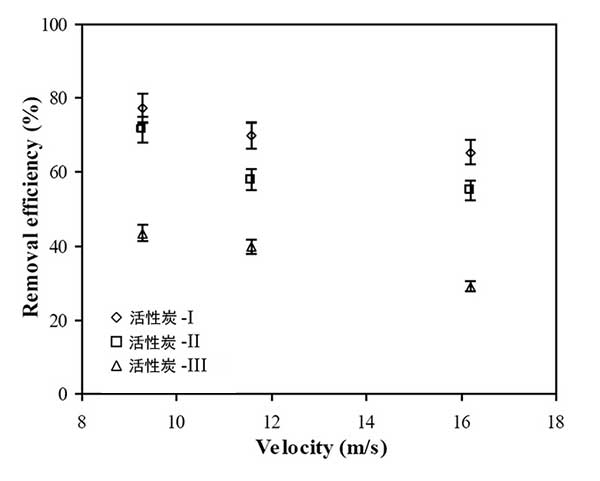 流速同時(shí)影響氣體吸附和活性炭回收,因?yàn)樗婕皻怏w和活性炭顆粒的混合程度、。圖3在各種活性炭吸附劑尺寸下,氣體去除效率和流量之間呈現(xiàn)出輕微的反比關(guān)系。最小的吸附劑(活性炭-1)以9.26米/秒除去77.4%的甲苯蒸氣,然后以16.2米/秒降至65.4%。微粒活性炭吸附劑捕獲沿著旋風(fēng)分離器的流動(dòng)路徑行進(jìn)的甲苯蒸氣。雖然在前面的的內(nèi)容說(shuō)過(guò)吸附量以高速增加,但是氣體去除效率相當(dāng)?shù)。這是因?yàn)樵诟吡髁肯录妆降慕^對(duì)體積要高得多。因此,即使活性炭吸附得更多,更多的氣體分子傾向于流出而沒(méi)有在內(nèi)部吸收。因此,關(guān)于顆粒回收和氣體去除效率的最佳流量必須通過(guò)在各種操作條件下的眾多實(shí)驗(yàn)來(lái)確定。