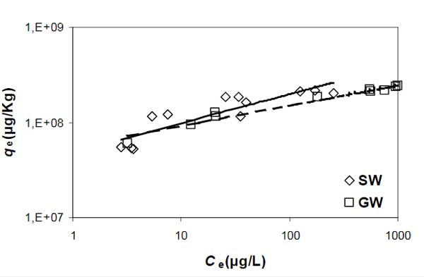 圖1:活性炭吸附菲等溫線(xiàn)(qe:每單位質(zhì)量固體吸附的溶質(zhì)質(zhì)量,Ce:平衡溶質(zhì)濃度; FW:淡水; SW:鹽水)。