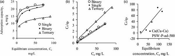 圖1. Cu(II)(a,b)和Ca(II)(c)的Langmuir等溫線,而Cu(II)吸附是從單(Cu),二元(Ca-Cu)和三元(Cu-Ni-)進(jìn)行的Pb)溶液和Ca(II)被活性炭吸附在二元溶液(Ca-Cu)中,初始pH值為5,初始濃度從<0到<100 mg L-1。