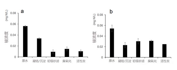 圖1:兩種樣品中原水中的銨濃度和水凈化過程的流出物(即沒有預氯化(a)和預氯化(b)。