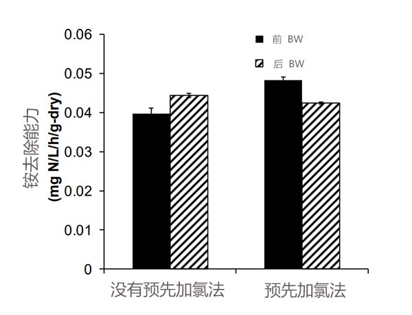 圖2顯示了反洗前后活性炭的銨去除能力的變化。沒有預氯化,銨去除能力為0.040mgN/L/h/g-dry。在第一次取樣后反洗(p<0.01)后,它增加了12%。另一方面,當實施預氯化時,去洗后的去除能力降低了12%(從0.048到0.042mg N/L/h/g-dry)(p<0.01)。