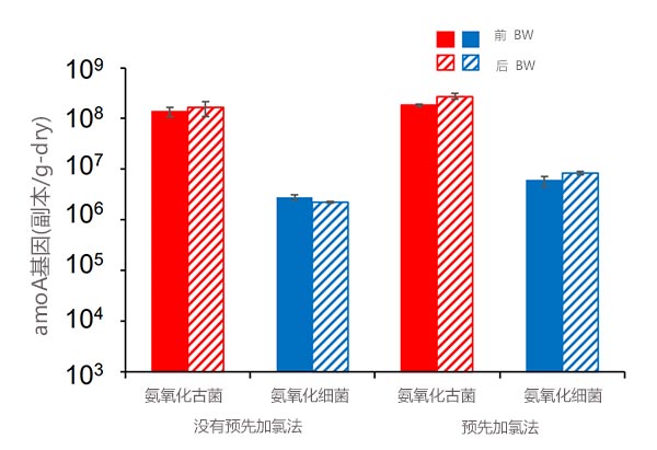 圖3:在“無預氯化”和“預氯化”的采樣時間之前(實心棒)和之后(帶斜線的棒)反洗的活性炭上AOA和AOB的豐度。
