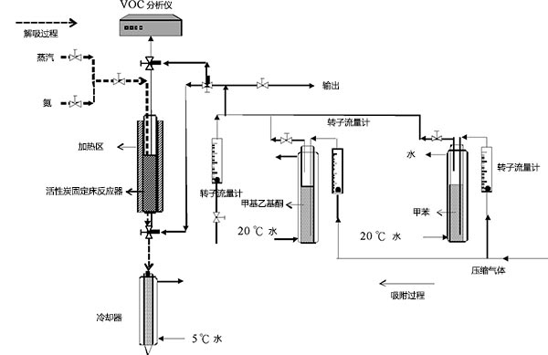 在稱重后將活性炭重新安裝到反應(yīng)器中。然后將閥門切換到解吸過(guò)程。將冷卻器的溫度設(shè)定為5℃,并加熱加熱帶直至達(dá)到解吸介質(zhì)的所需溫度(100℃或130℃)。解吸時(shí)間為10分鐘。當(dāng)反應(yīng)器的中心達(dá)到約35℃時(shí),將解吸介質(zhì)引入反應(yīng)器中。然后收集解吸的溶劑。當(dāng)滿足設(shè)定的解吸時(shí)間時(shí),終止加熱和解吸介質(zhì)并且溫度開始下降。此后,將吹掃的壓縮空氣注入(在某些實(shí)驗(yàn)測(cè)試中使用氮?dú)?到反應(yīng)器中,直到中心溫度降至室溫。收集解吸的溶劑并稱重用于計(jì)算活性炭的工作容量。工作容量定義為吹掃后飽和VOC吸附容量與碳上殘余VOC的差值。然后使用氣相色譜儀分析溶劑的組成。