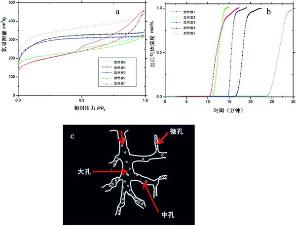 圖2:(a)氮吸附等溫線,(b)活性炭樣品的C 3 H 8吸附結(jié)果,(c)吸附在活性炭中的氣體的卡通圖像。