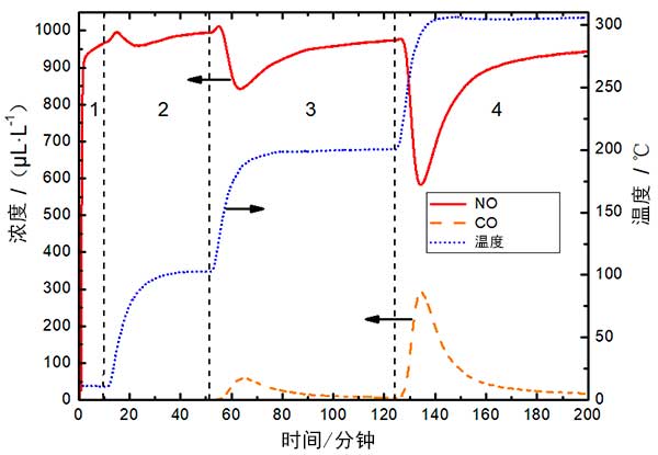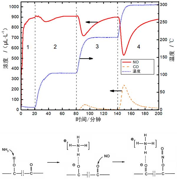當(dāng)溫度低于300℃時(shí),作為還原劑的活性炭的脫硝能力差。為了進(jìn)一步提高活性炭的脫硝能力,NH 3通常加入作為還原劑。如圖3所示,當(dāng)入口氣體為1000μL/ L NO +1000μL/ L NH 3時(shí),研究了活性炭在不同溫度下的脫硝能力。本文使用的煤質(zhì)活性炭是酸性的,含酚羥基的官能團(tuán)相對較高,促進(jìn)了脫硝。它可以從之間的比較可以看出圖2和圖3中,加入NH后的趨勢和CO的濃度3基本上相同,而不NH 3,表明NH 3對含氧官能團(tuán)的分解沒有效果。