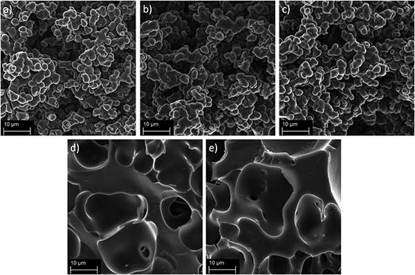 通過掃描電子顯微鏡對(duì)高比表面積活性炭進(jìn)行表征于圖2a-c中?梢钥闯龅氖沁@幾種活性炭具有它是由球形碳顆粒的尺寸與周圍3μm的孔隙網(wǎng)絡(luò)結(jié)構(gòu),這是典型的基于甲醛樹脂活性炭。球形活性炭納米顆粒的燒結(jié)導(dǎo)致孔隙網(wǎng)絡(luò)內(nèi)的空腔,其在直徑為2至20μm的形成;钚蕴勘砻媸枪饣,沒有燒結(jié)的球形活性炭納米顆粒,而它們?nèi)匀辉诰W(wǎng)絡(luò)內(nèi)具有相似直徑的空腔。由于在化學(xué)活化之前低的預(yù)碳化溫度,球形納米顆粒在活化過程中強(qiáng)烈聚集,這導(dǎo)致如前所述的較不剛性的孔隙網(wǎng)絡(luò)。
