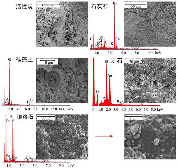 掃描電子顯微鏡(SEM)圖像和反應材料的化學微范圍分析(EDS)如圖2所示。值得注意的是,活性炭樣品具有大膨脹的多孔表面,內部孔隙的尺寸達到十幾微米到幾百微米。石灰石砂的SEM分析證實了這種材料的碳酸鹽特征,而鈣和氧的微區(qū)化學分析指向方解石(CaCO 3))。SEM-EDS分析表明硅藻土樣品中存在來自二氧化硅基團的礦物,并允許將該材料的巖相分類為硅藻土。SEM微圖像證實了中等發(fā)展的沸石和埃洛石的表面,并且在后一種材料的情況下,存在特征性的納米管,然而,在該放大率下不是非常明顯。此外,EDS光譜指出沸石樣品中存在:硅(Si),氧(O),鋁(Al),鉀(K),鈣(Ca)和鐵(Fe),以及:鐵(Fe) ,埃洛石樣品中的鋁(Al),硅(Si),鎂(Mg),磷(P),鈣(Ca)和鈦(Ti)。